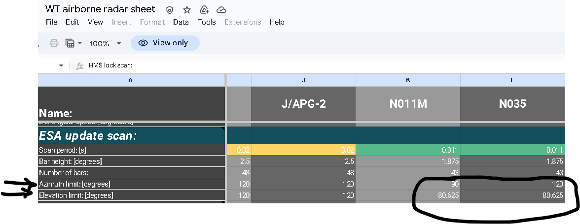 So while back, during a heated discussion on radar performance, Primarily about on ESA update scan on targets away from where its actually scanning, I stated that, Su30sm2(N035),Su30sm(N011) do not scan past a certain point from their centralized radar scanning area. To further verify this, We have a lovely sheet made by a good and credited Dataminer called Valyrie(Horiane), Ill be linking the sheet at the end, he has multiple spread sheets and ill guide you where the exact code based extracted information I am talking about is linked.