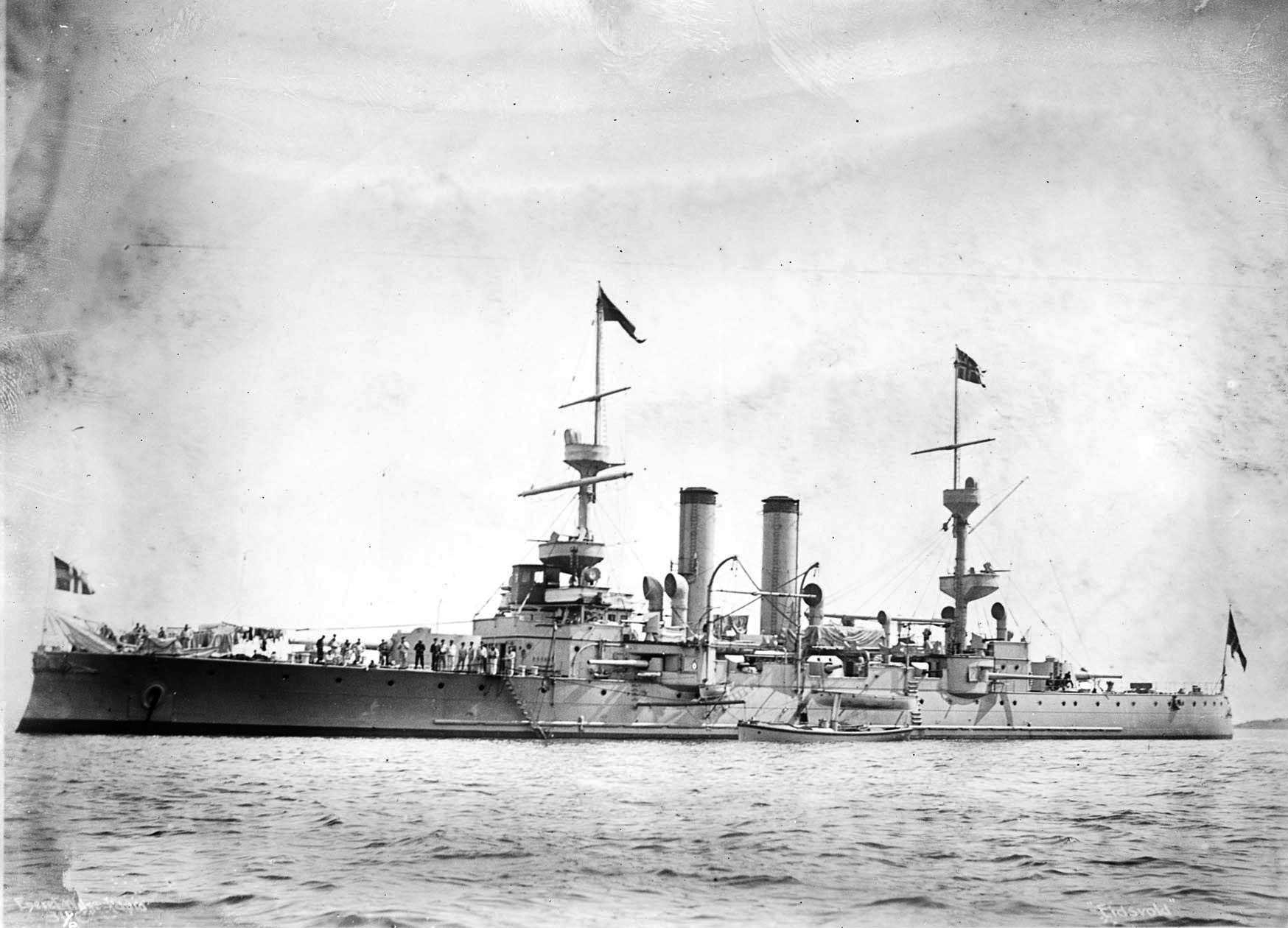 Two Swedish Sverige-class coastal defence ships alongside Danish coastal defence ship Peder Skram in 1935