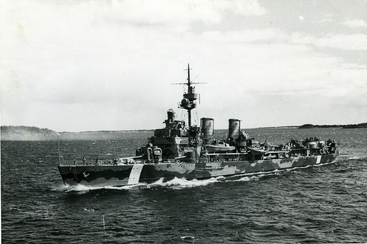 Swedish coastal defence ships Gustaf V and Drottning Victoria alongside Finnish coastal defence ship Ilmarinen in 1938