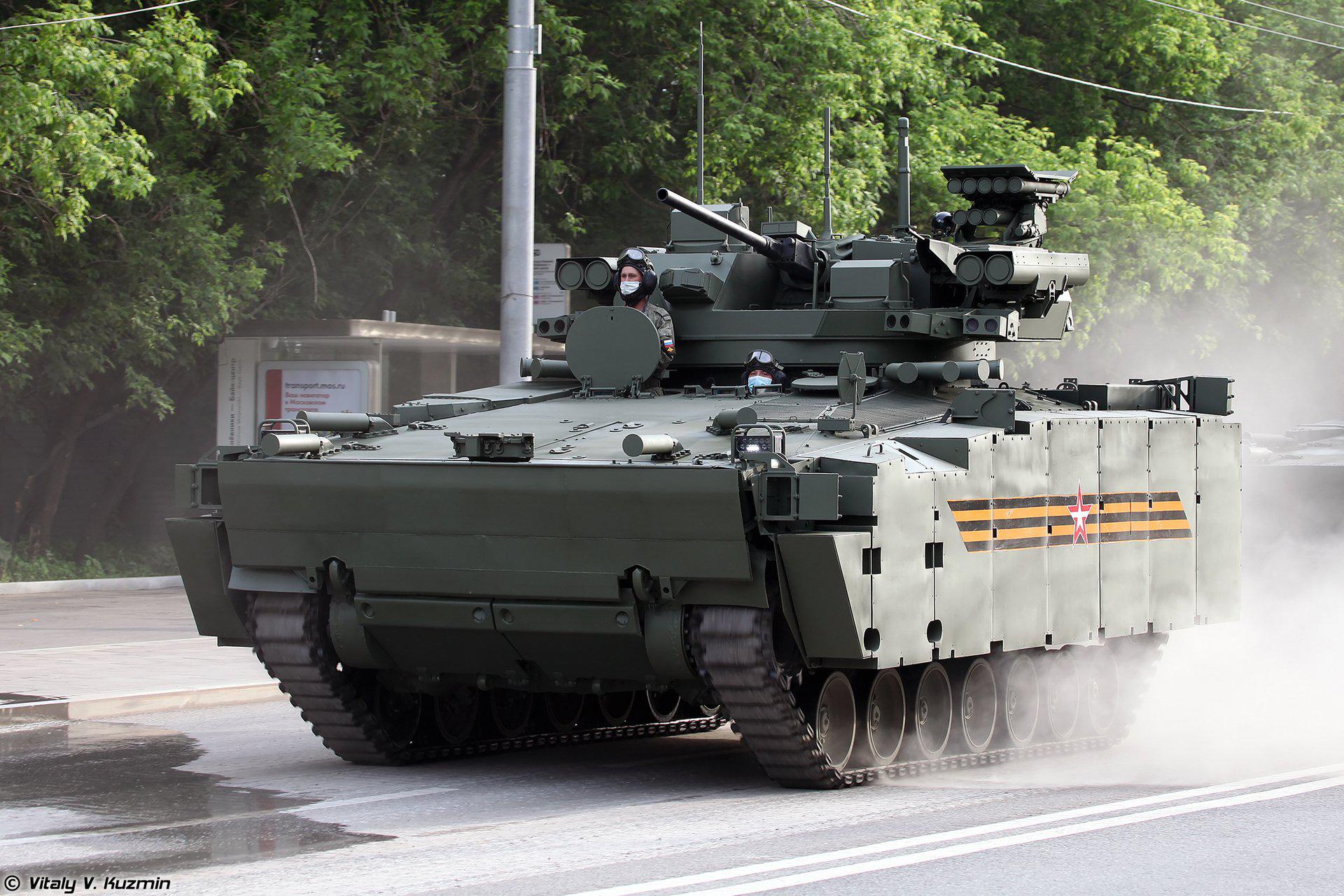 It is armed with the 57mm from the 2S38 and 9M133 (Kornet ATGMs) in an unmanned turret. It has an hard-kill active protection system and can go at a top speed of 70km (also has good reverse speed.