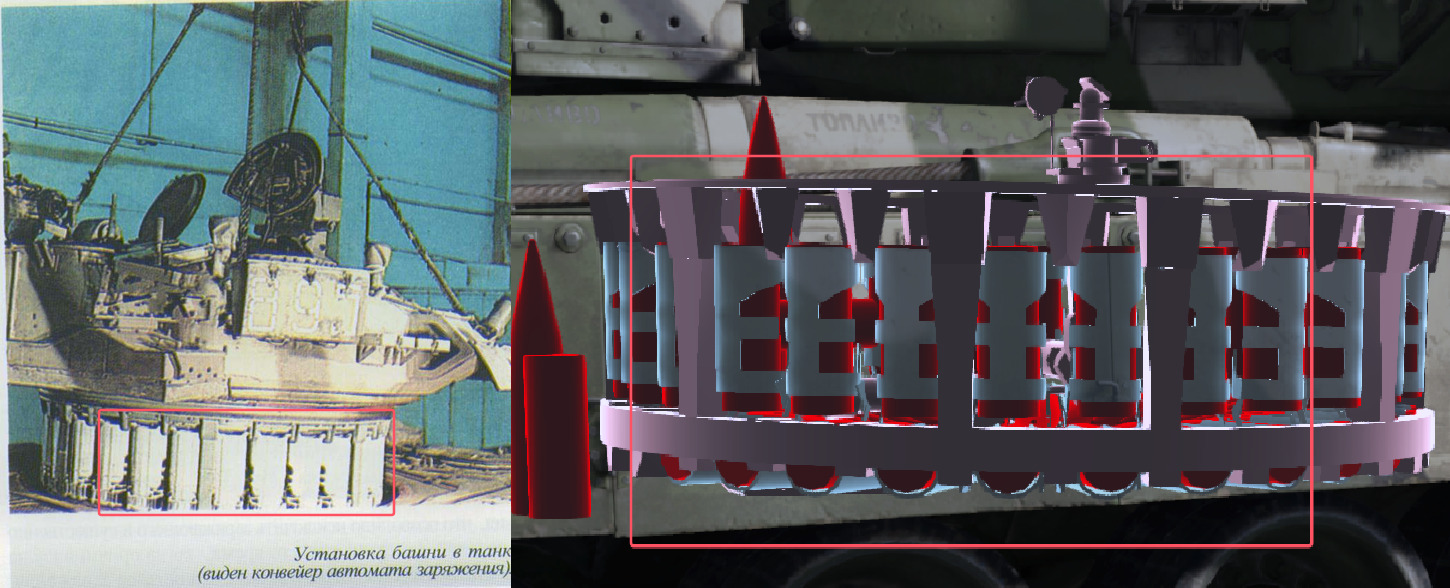 As shown in the screenshots, the charge on the T-72/T-90 series are visibly larger than the projectiles, whereas the charge on the T-64/T-80 series match the unit size.From real photos of 125mm ammunition and photos of the T-80U tank autoloader, it can be seen that in reality, the charge of Soviet/Russian 125mm rounds is noticeably larger than the projectile. At the same time, there are no large gaps between the charges in the the autoloader.