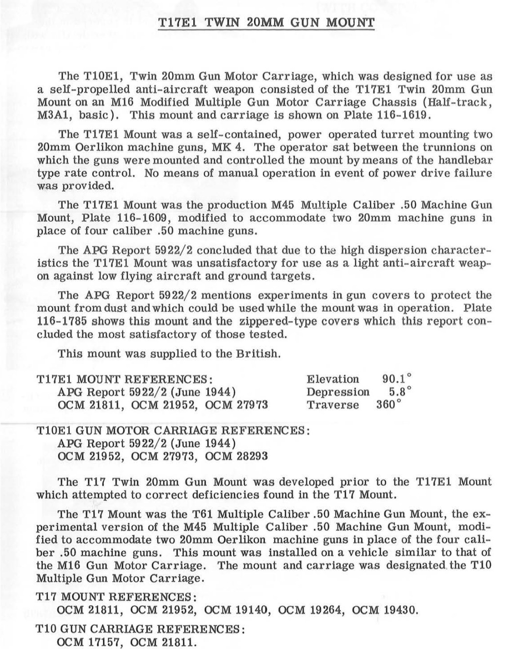 By the later stages of WWII, it was clear that something new was needed for mobile air defense. The US Army had been using the M13, M15, and M16 half-track systems for SPAAGs, but as newer and better enemies were faced, new ideas needed to be tested. Many prototype anti-air vehicles were developed and tested by the US during and after the war, but one in particular came very close to full production and service. The T10E1 GMC (Gun Motor Carriage) was a further development of the M13 and M16 GMC lineage. Initially the program was started as the T10 which was based on the M2 half-track car. This was deemed unsatisfactory however and the project was moved to the larger and more robust M3 half-track. The armament consisted of a Maxson M45 Quadmount repurposed to hold a pair of 20mm Hispano-Suiza HS.404 autocannons. This would dramatically improve the firepower of mobile anti-air units, and so in March of 1944 the White Motor Company was contracted for production of prototypes. They were built from existing M16 MGMCs, with 110 in total being converted. They would not move beyond the testing phase, however, and eventually all but one would be converted back into M16 MGMCs. The last T10E1 was retained as a historical piece at Aberdeen Proving Grounds. Interestingly, a similar development would see major use in Israel. Known as the TCM-20, it would become the primary anti-air artillery of Israel until the M163 Vulcan. The TCM-20 was exactly what this attempted to be, with an M45 mount holding two HS.404 autocannons. It was used on multiple self-propelled mounts (M3, BTR-152, RAM V-1) as well as a static towed mount. Perhaps this inspired the development of the TCM-20 system?Description: