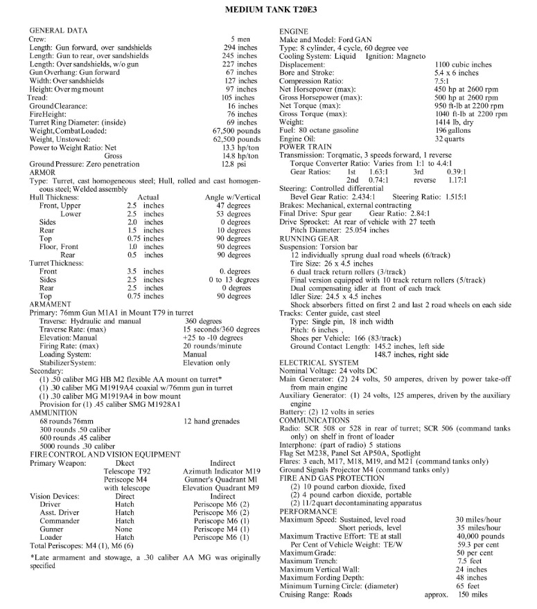 Although the T20E3 project was ultimately discontinued, its torsion bar suspension was not wasted. The system would be carried forward into 1944 designs, such as the M26 Pershing and M24 Chaffee.