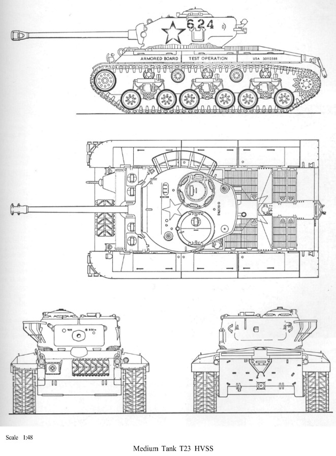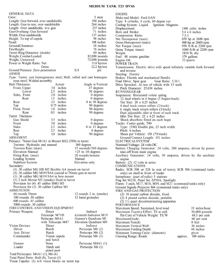 Nevertheless, just as with the torsion-bar T23E3, the HVSS-equipped T23 came too late. By late 1944, focus had shifted toward the T25 and T26 series with 90 mm guns, while the electric-drive T23 and its experimental derivatives were rendered obsolete.
