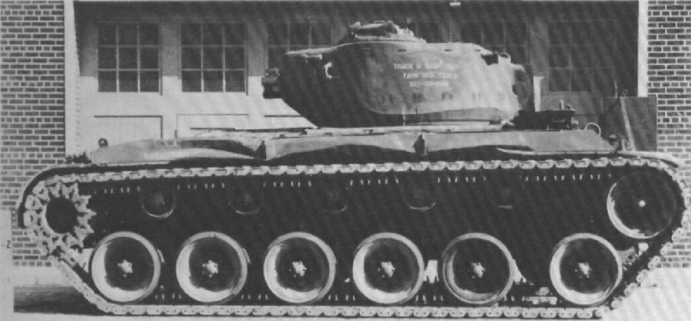 The T23E3 ran on 19-inch-wide center-guided tracks supported by torsion bar suspension, with six dual road wheels on each side. The first two and last two road wheels were fitted with shock absorbers, and five dual return rollers supported the tracks. This design was intended to improve ride quality and reduce ground pressure compared to the VVSS system.