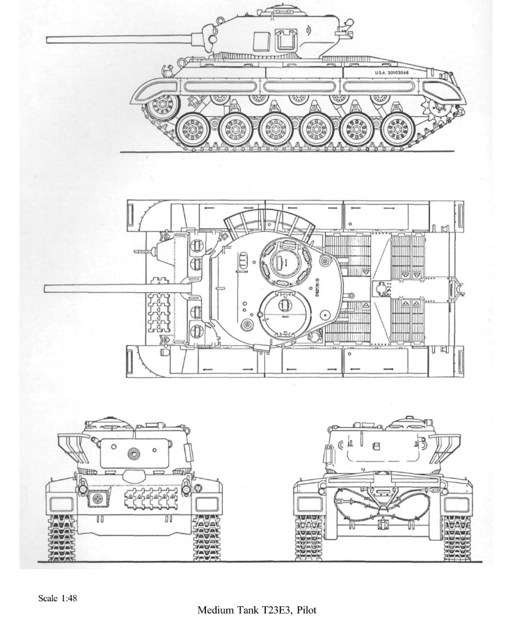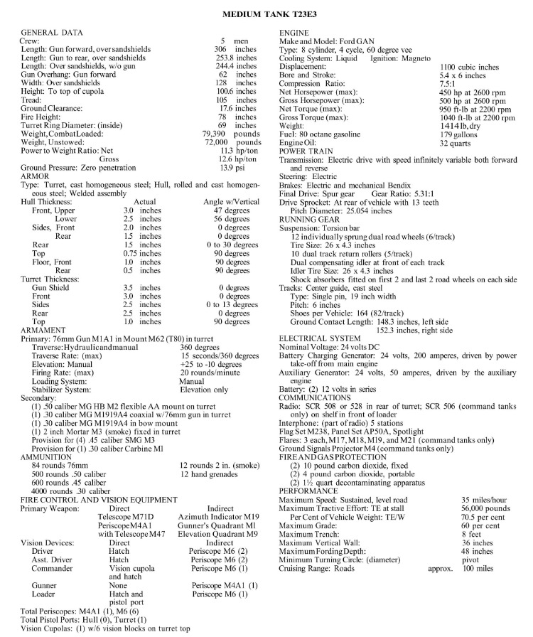 The turret and much of the equipment were carried over from production T23 number 19, whose registration number the T23E3 also inherited. The turret was updated by removing the basket and relocating equipment previously mounted on the turret platform. Its suspension and tracks were adapted from a T25E1 medium tank tested at Aberdeen, while a newly manufactured hull was built specifically for the T23E3. Once completed, the pilot vehicle was shipped to the Armored Board at Fort Knox for testing.