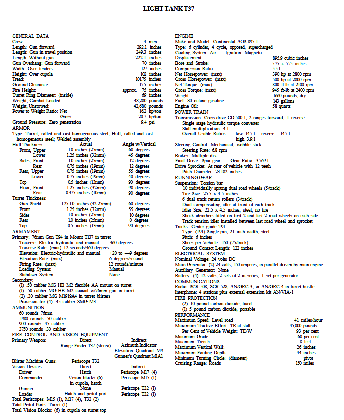 The T37 was manned by a crew of four. The driver sat on the left side of the front hull; an ammunition rack for the main gun occupied the right side. The turret housed the commander, gunner, and loader. Power was provided by the new AOS-895-1 gasoline engine paired with a compact CD-500 cross-drive transmission, which offered improved mobility over the M24.