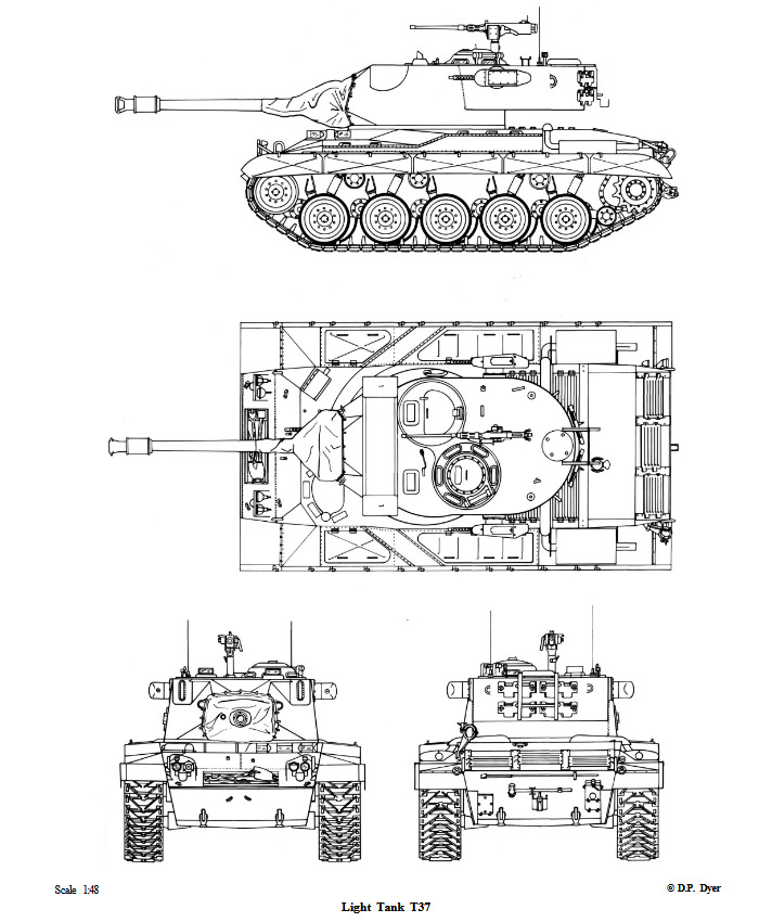 The T37’s development ended there, as it was not selected for production. However, the additional pilots were completed with a Phase II turret, which mounted the higher-velocity 76 mm gun T91 along with a Vickers fire control system and stabilizer. This configuration was redesignated T41 Light Tank, which in turn evolved into the T41E1 and ultimately the standardized M41 Walker Bulldog. In production, both the rangefinder and stabilizer were omitted. Therefore, the T37 served as a significant stepping stone toward the US Army’s postwar light tank, the M41.