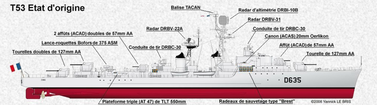 Wishing to acquire anti-aircraft escorts with good combat capabilities to strengthen its fleet, decimated by the Second World War, France launched a major construction project for this type of ship in the late 1940s and early 1950s, thus giving rise to the three major classes of anti-aircraft escorts: the T47, T53, and T56 classes. The 14th of these ships and the last of the T53 class, the Jauréguiberry features all the characteristic features of these ships: high speed, decent anti-aircraft weapons, and modern equipment such as radars.