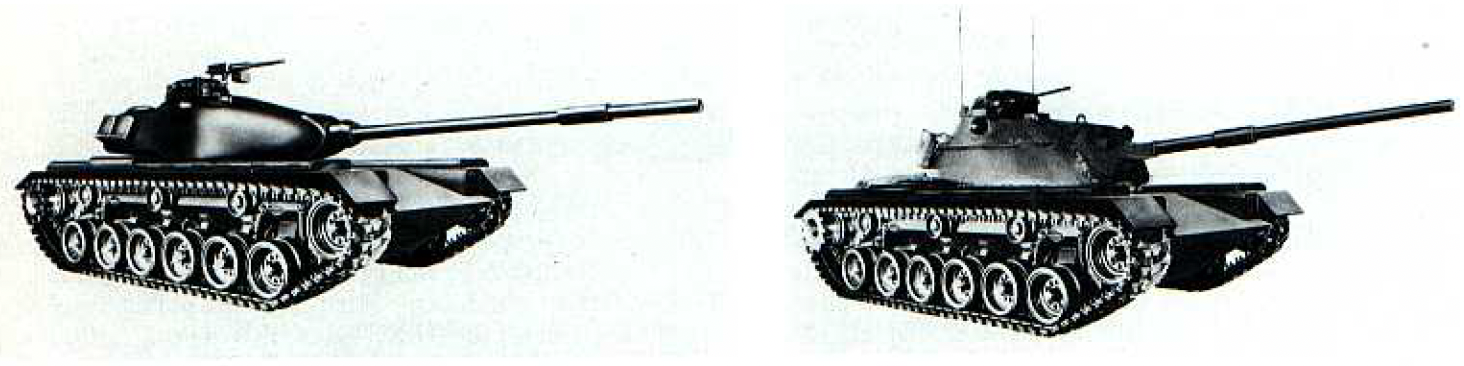 XM60 concepts. On the left is the XM60 fitted with the 120mm T123E6, in a T95E6-style turret. On the right is the XM60 with the 105mm T254, in an M48A2 (T95E5) turret.