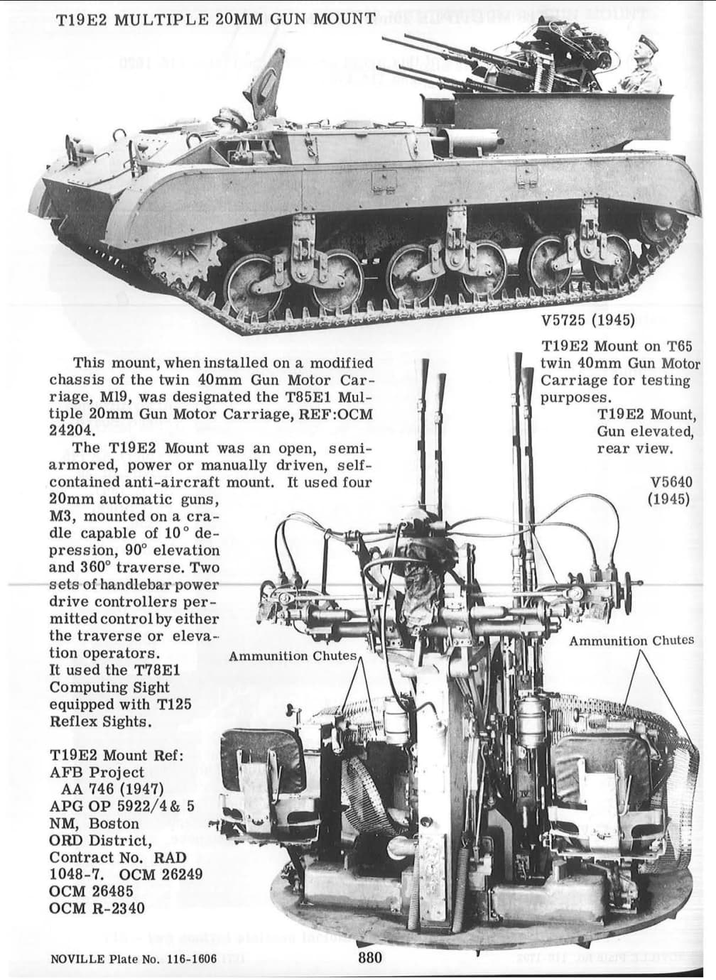 In May 1943 the Ordnance Committee wanted to develop a 4 x 20mm anti aircraft gun to be mounted on a mobile carriage. The plan was approved in June and soon they came up with 4 different quad mount designs. The first 2 were both based on the .50 Maxson mount where one is armed with 4x20mm Oerlikon MK IV (designated T18) and the other armed with 4 x AN-M2 (designated T18E1). The other 2 quad mounts were both based on the twin 20mm gun mount T4 equipped with a hydraulic drive and a Sperry K sight. They were designated as the T19 ( Oerlikon) and T19E1 (Hispano-Suiza) respectively.