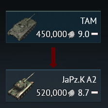 As you can see above, the JaPz.K A2 sits at a BR of 8.7 and sits as a subfolder of the TAM, which sits at 9.0. At it’s current state, the JaPz.K A2 is rendered useless - If you were to get it, you’d have to first buy the TAM, which is a great addition to your 9.0 lineup but if somebody has already grinded 8.3/8.7 and now wants to grind 9.0, what use would the JaPz.K A2 have? Sure it has a 4s reload but it lacks a stabilizer so why waste 520k SL on a slightly better tank when you already have one that does the job? I would propose a swap - with the TAM as a subfolder vehicle of the JaPz.K A2 .