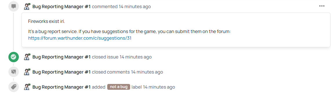 “Fireworks exist IRL” 🤣 What a silly response. I might make a suggestion post. I would advise everyone else NOT to make a suggestion thread until we have had communication with a suggestion moderator to ensure it does not immediately get hidden/denied. I will attempt to contact a suggestion mod today if I have time; going to be a busy day for me though. Not going to be around the computer much, it’s harder to write and add the appropriate info from my phone.