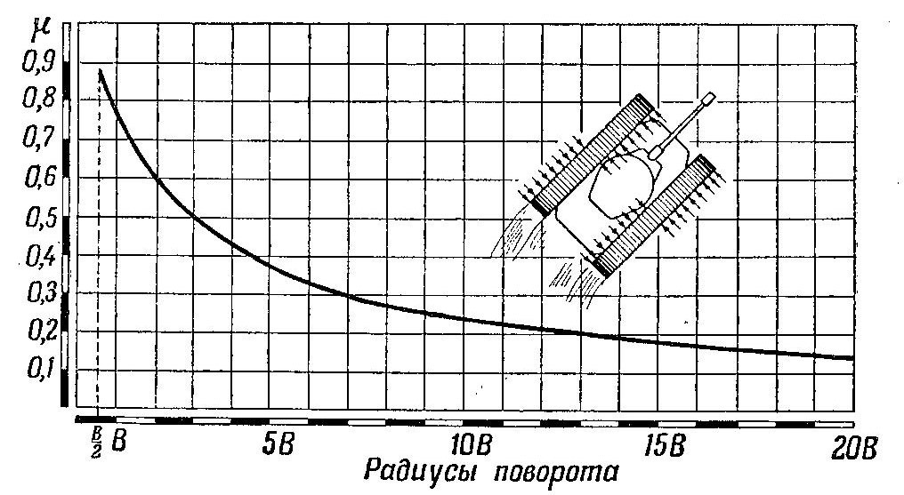 Here is a diagram quoted from a Soviet tank manual. This is a graph showing how much turning resistance is generated relative to the tank’s turning radius.