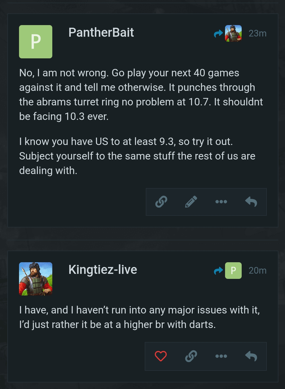 No, I am not wrong. Go play your next 40 games against it and tell me otherwise. It punches through the abrams turret ring no problem at 10.7. It shouldnt be facing 10.3 ever.