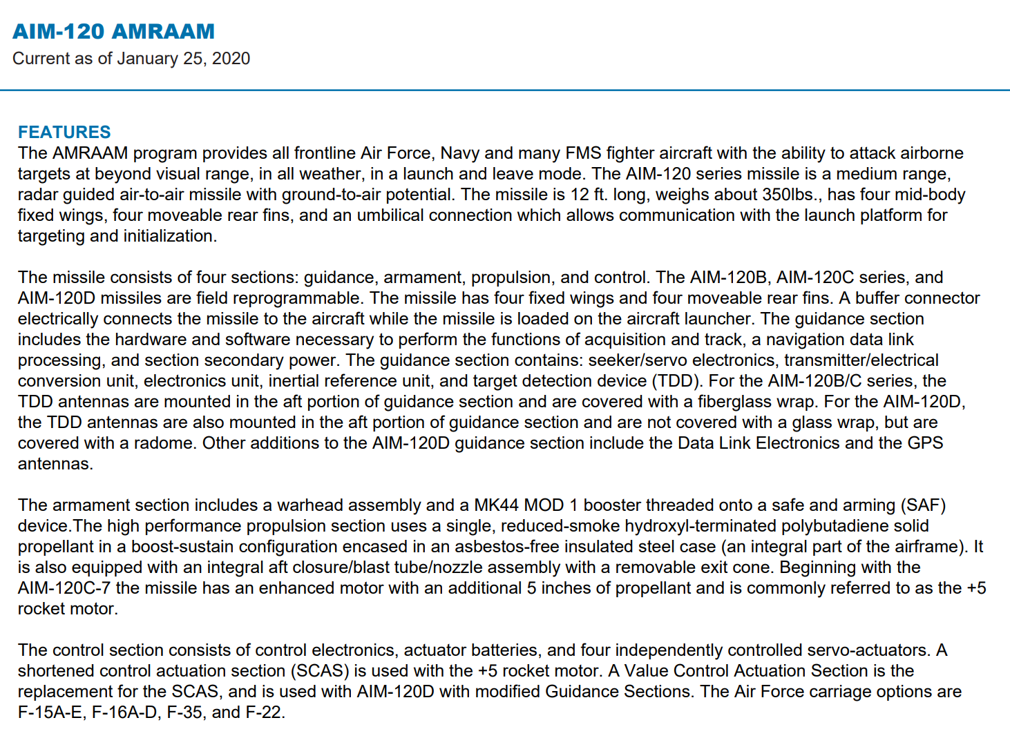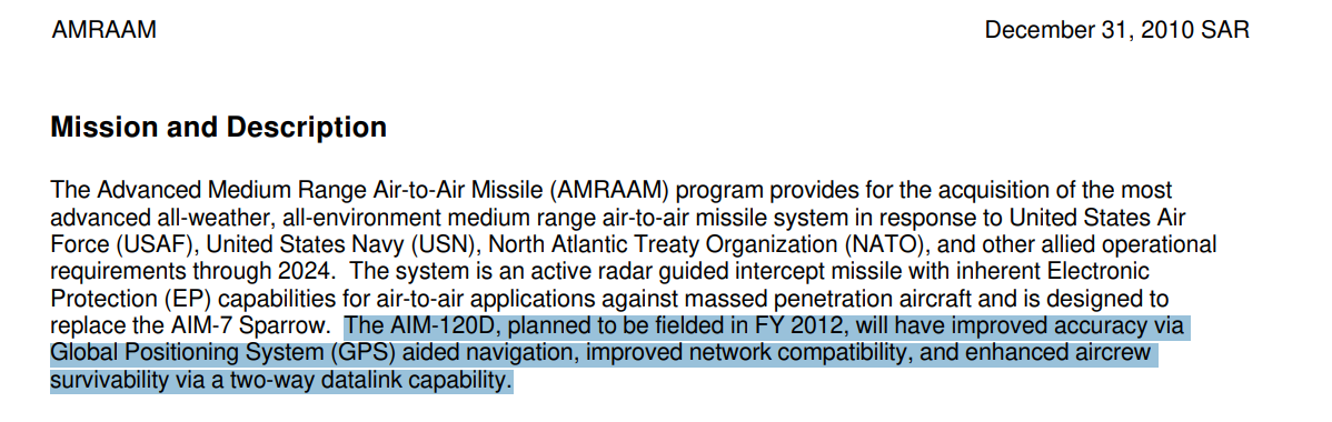 "Beginning with the AIM-120C-7 the missile has an enhanced motor with an additional 5 inches of propellant and is commonly referred to as the +5 rocket motor. "
