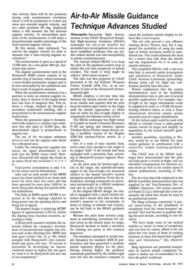 In addition, an F-106A was used to test the nuclear-armed AIM-26A Falcon as part of the Simplified High-Accuracy Guidance (SHAG) program, as reported in Aviation Week & Space Technology (January 20, 1975 issue). This article describes the employment of the AIM-26A by the F-106A in conjunction with the helmet-mounted sight system.