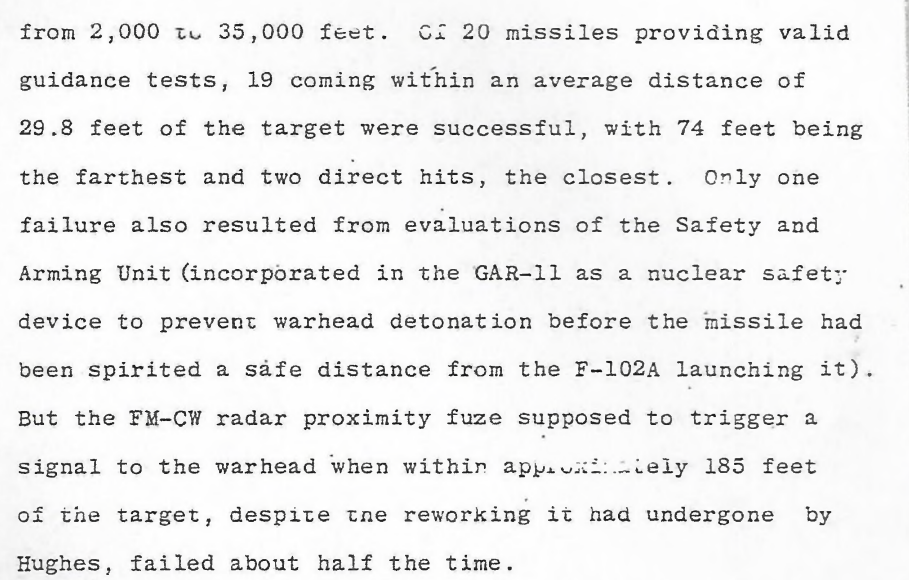 The whole system was advertised to reduce the cost of air to air missile avionics - this guarantees it has to work with cheap conventional explosives, as opposed to very tightly controlled nuclear warheads. Furthermore, the only nuclear air to air weapon in service at the time (1975) was the AIR-2B unguided nuclear rocket, an improved version of the mb-1 rocket which had entered service back in 1957, with the AIM-26A itself having been decommissioned back in 1972 (which is one of the reason they had a few spare missiles available for testing), and there were no plans for a replacement. How you arrive at the conclusion they were testing a system that would only be usable by nuclear air to air missiles is beyond me…