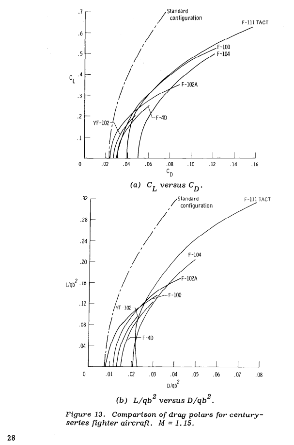Some lift drag polar comparisons between century series aircraft (+F-4D Skyray and a NASA modified F-111) at mach 1.15. L is lift, W is weight, D is drag, q is dynamic pressure and b is wingspan.