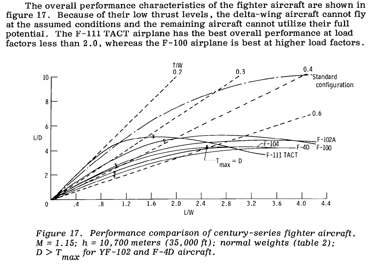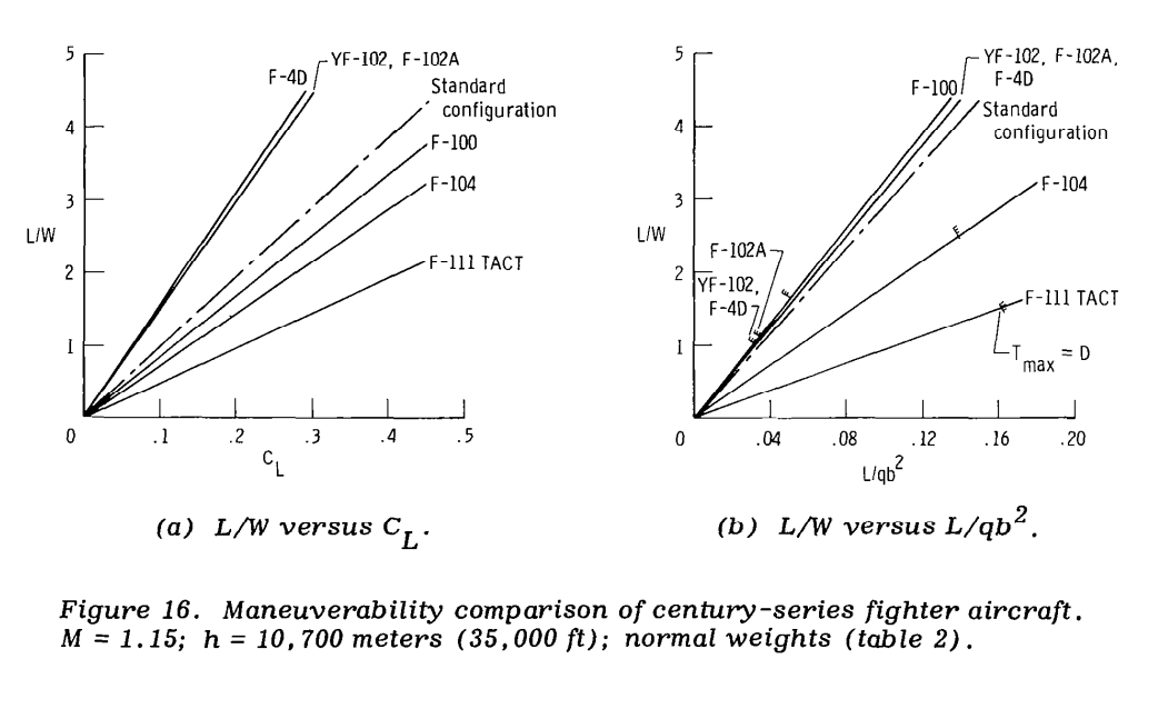 P.S: Maybe this chart is clearer. For reference, at mach 1,15 and 35 000 feet, the F-102A has a maximum L/D slightly less than 5, slightly less than 0,4 thrust to weight ratio, a sustained 1G load factor (basically can’t turn without losing speed or altitude), and a maximum instantaneous load factor greater than 4,4 G’s (slightly over 5Gs). Keep in mind that NASA’s F104 is stripped out of everything so it’s 2500 lbs lighter than the ingame F104G.