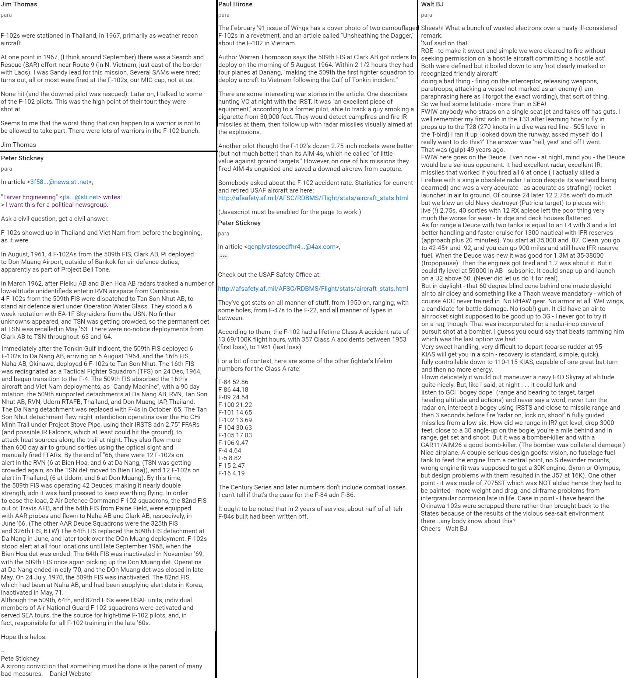 This article has a pretty detailed account of some of the F-102’s activities throughout the 8 years it was in service over Vietnam. To it, I would add some quotes from some old usenet forums.