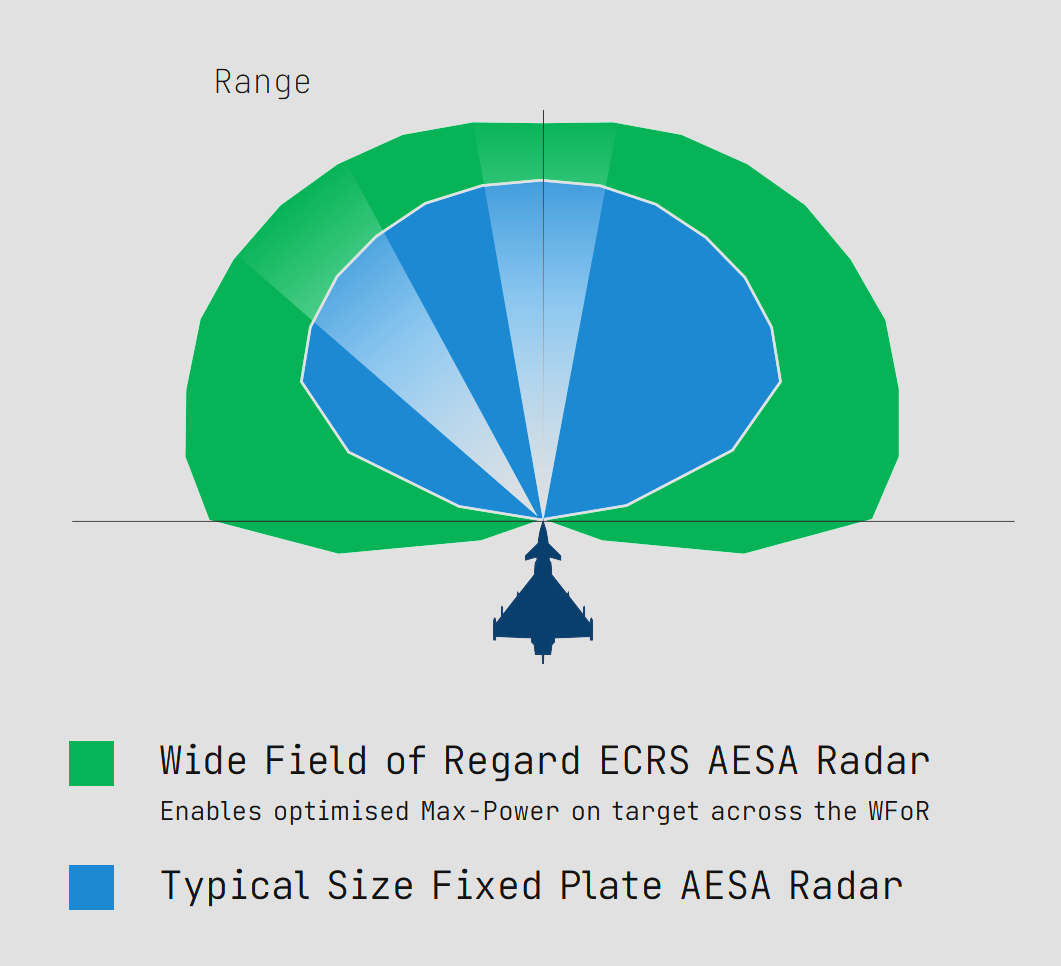 Despite some sources from Airbus and the Eurofighter consortium claiming the ECRS Mk1 has an FoR of ±100° like ECRS Mk0 and ECRS Mk2, gaijin has denied all bug report attempts to increase the FoR for ECRS Mk1 in-game, due to Hensoldt claiming ±90° FoV. It has been suggested the discrepancy in radar coverage is likely due to a slight difference in how the different companies judge radar coverage, as unlike mechanical radars, ESA radars have decreased range at the limits of their beam steering limits. This effect can be seen below in the ECRS coverage presented on this display, where the ECRS radars are capable of max range coverage out to ±90° off-bore, but radar range decreases beyond that point.