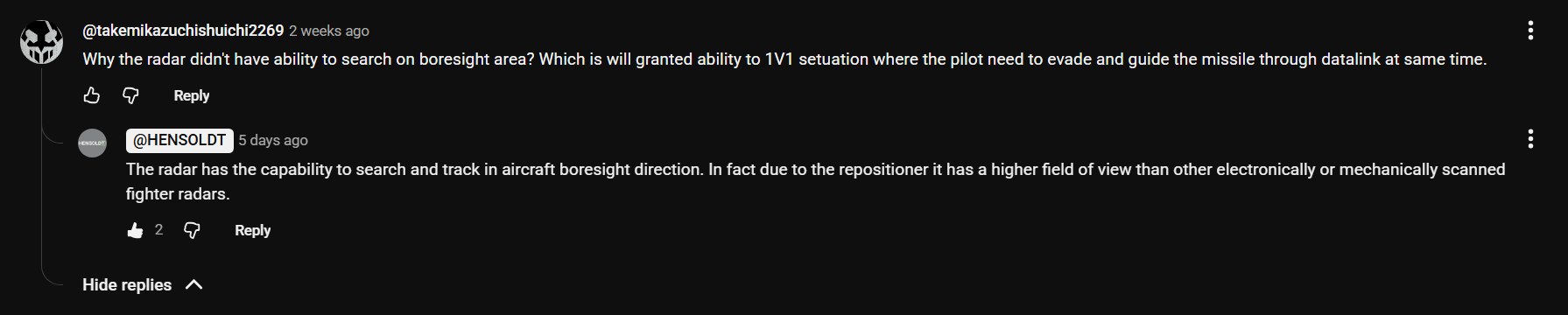 Hensoldt also answered on their youtube. Wasn’t me asking the question and its terrible english but I mean what more information can we give that doesnt reach into classified territory? Gaijin said they wont change stuff based on assumptions but at this point they are straight ignoring the manufactures claims. What else do they want? We are reached the limit of accurate unclassified informations. Now have to make the game somewhat fair and believe in the information we have. The more modern the aircraft the more we have to assume, it is what it is. Accuracy aside we need to keep the game somewhat fair if we cant confirm 100% whats right or wrong.