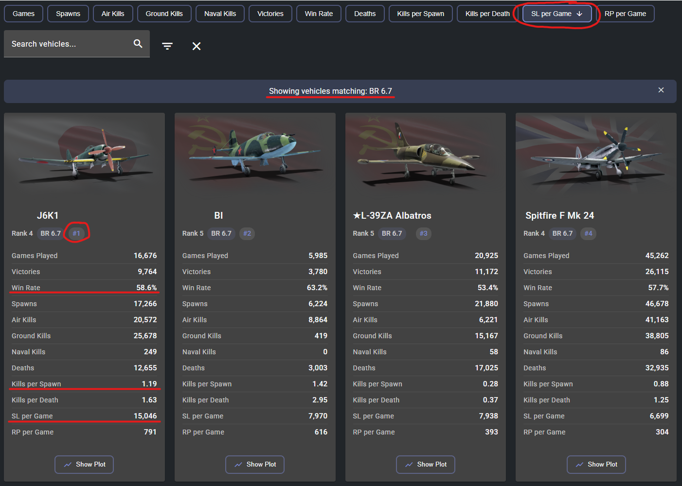 For the latest Month’s data (November) in Air Arcade it is #1 for SL’s per game for all 6.3 BR aircraft, among all nations. Very high win rate, very high Kills per Spawn & Death: