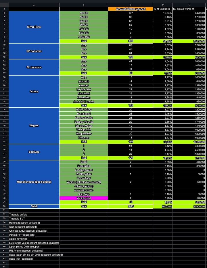 If you just want to skip to war_Tinder’s spreadsheet, here it is: WT community gambling box data - Google Spreadsheets