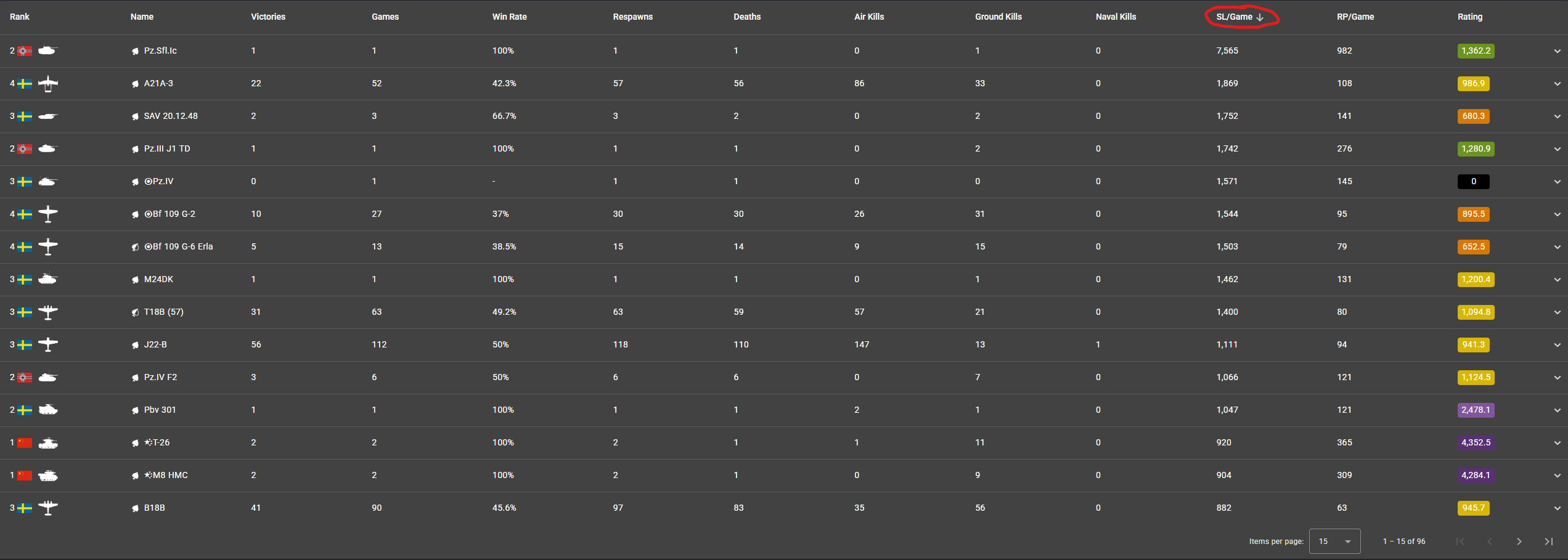 Here we go, Statshark is working today. Yup, your Sherman III/IV is far and away your best performing tank going by SL/Game. Your Bf 109 F-4 is your current best plane, but you have played very few matches with it still. So, the stats might change if you use it a lot more. Personally, I usually filter by 50+ games to exclude vehicles that I have not used enough to become fully comfortable with. (I left that filter off for these screenshots so you can see more info.)