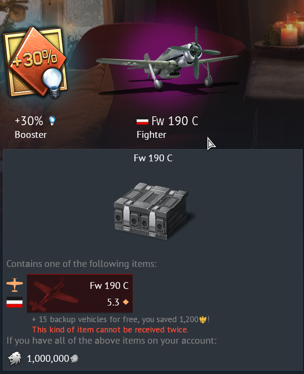 SO! Just in case you did not know yet, premium vehicles DOUBLE the effect of SL boosters! (As well as doubling the SL % boost from Premium Time.) During the SL Crate events I can make as many or MORE SL’s than I did in the previous 2-3 months. If you really really want to push the SL crates, I would highly suggest getting premium time. I just get the 180 days of prem time 2x a year when it goes on sale for 50% off, only $20. $40/year, or $3.33/month. (If you don’t already have prem time, and don’t mind spending a little, you could get like 1 month for the crate event, and then get the 180 day thing off webstore during the Anniversary sale.) It is NOT on sale right now, so $40. But on 50% sale drops to $20: Gaijin.Net Store - Premium account for 180 days