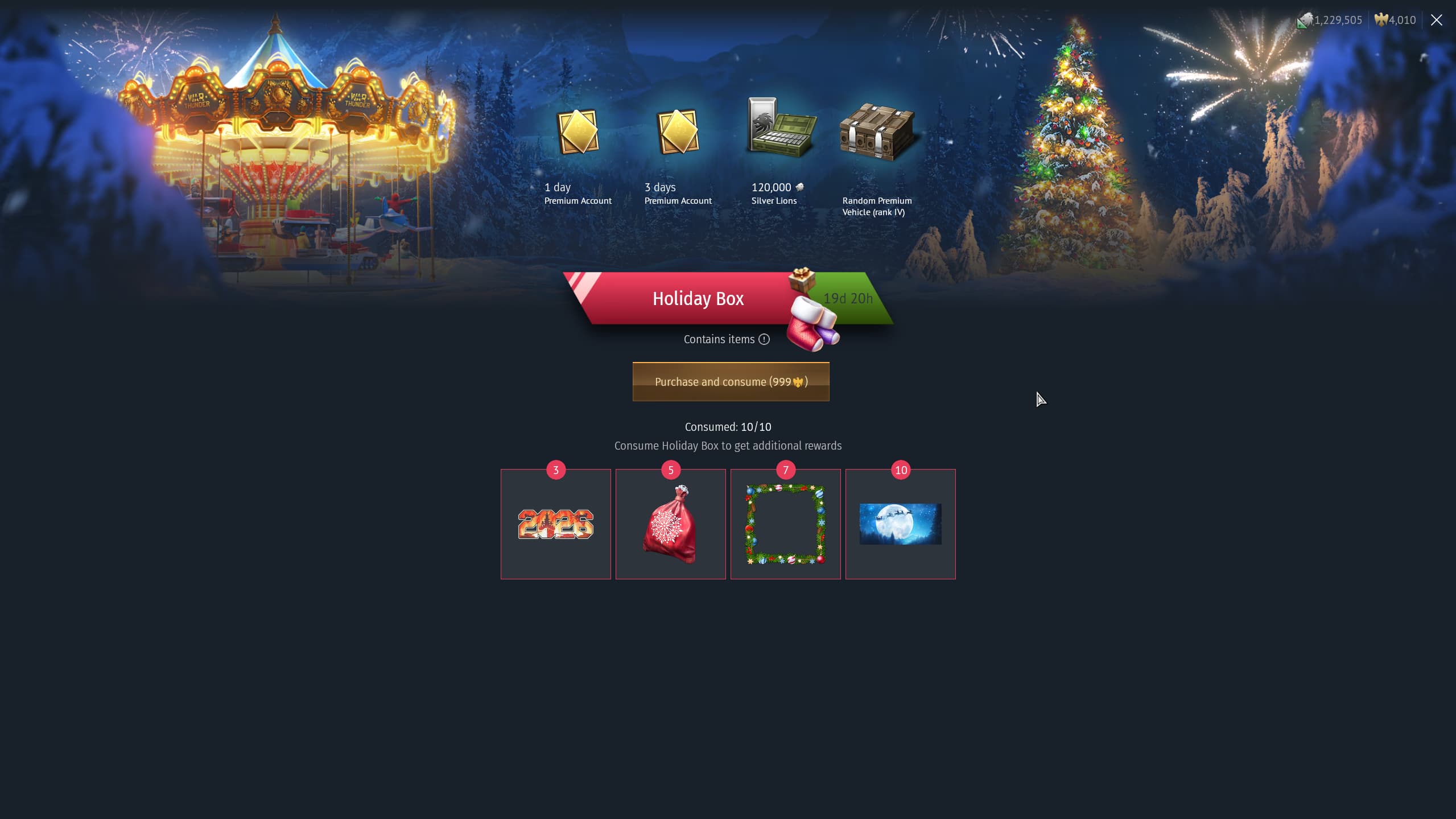 As per tradition, the Holiday Box awaits you in the in-game Item Shop, available for purchase with Golden Eagles. It contains a variety of useful items, including a Premium Account, Silver Lions, universal backups and boosters, premium vehicles, and all vehicles that were previously sold for Golden Eagles or War Bonds but are currently not available in-game or on the Market (list below).