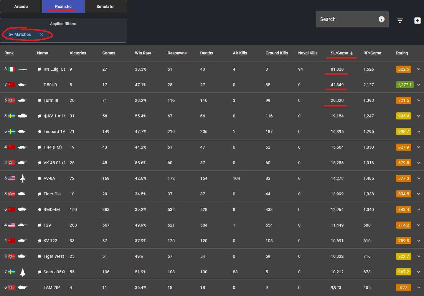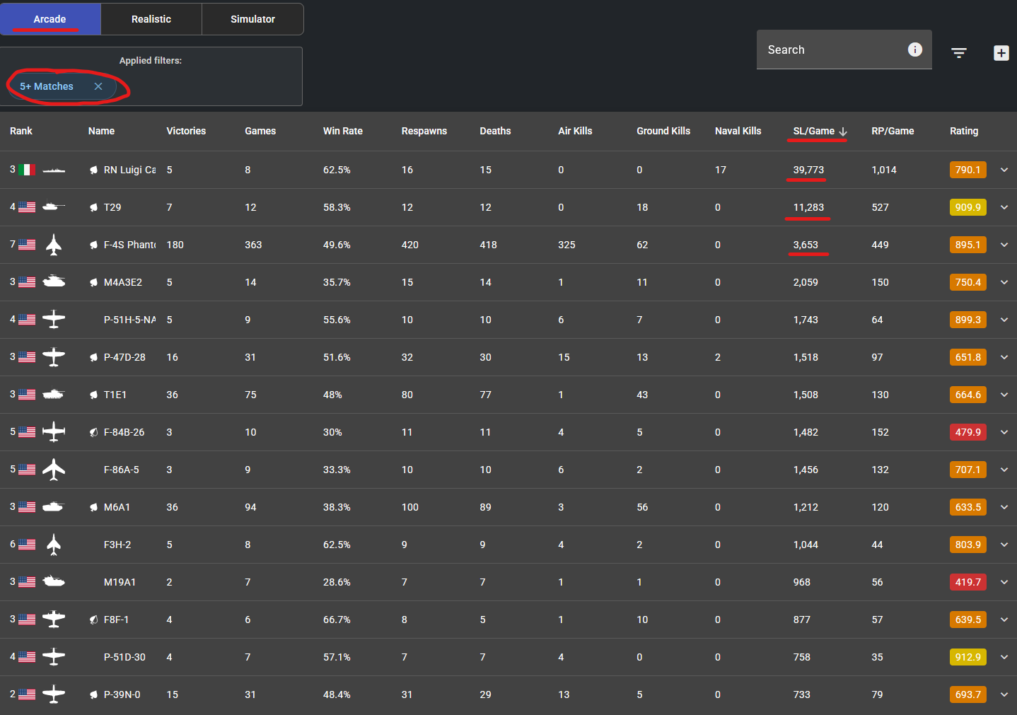 Your top 15 vehicles SL’s/Game for Arcade, filtered by vehicles that you have played 5 or more matches with: