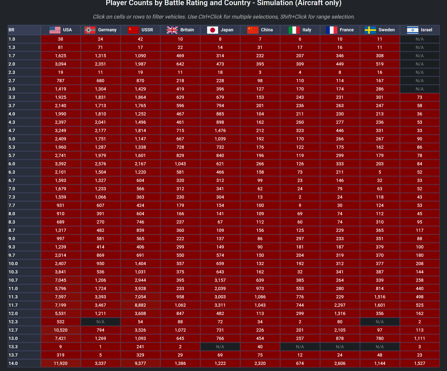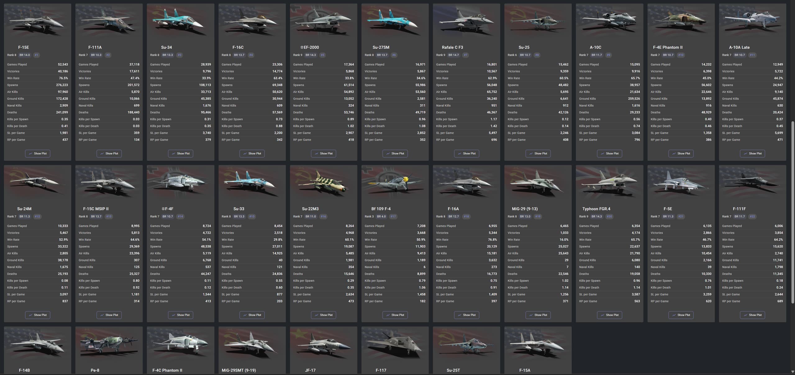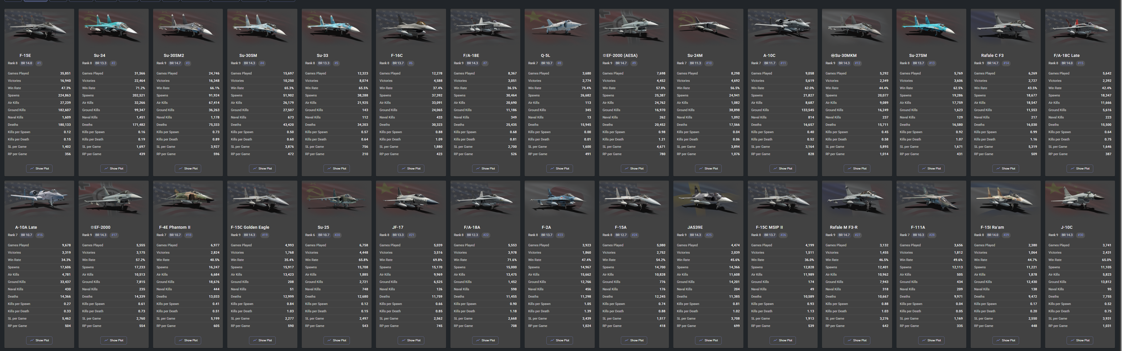 Let’s look at the Eurofighters for a second since most Eurofighter nations have not really received anything noteworthy for their top tier lineup since December of last year. We could also use USA but I am not going to do try to normalize player population for addition of new F/A-18 etc.