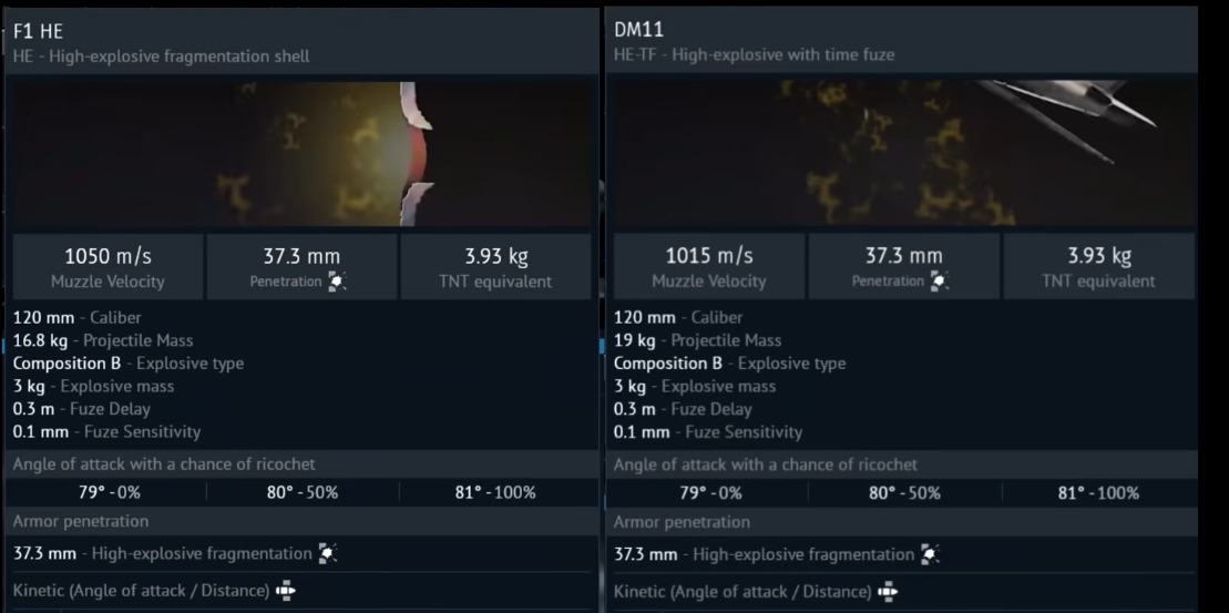 What a strange round, “F1 HE” is very general, 16,8kg mass indicates that this is may be the 120 EXPL F1, but muzzle velocity is of OE 120 F1 (yes, wikipedia is not a reliable source but still)