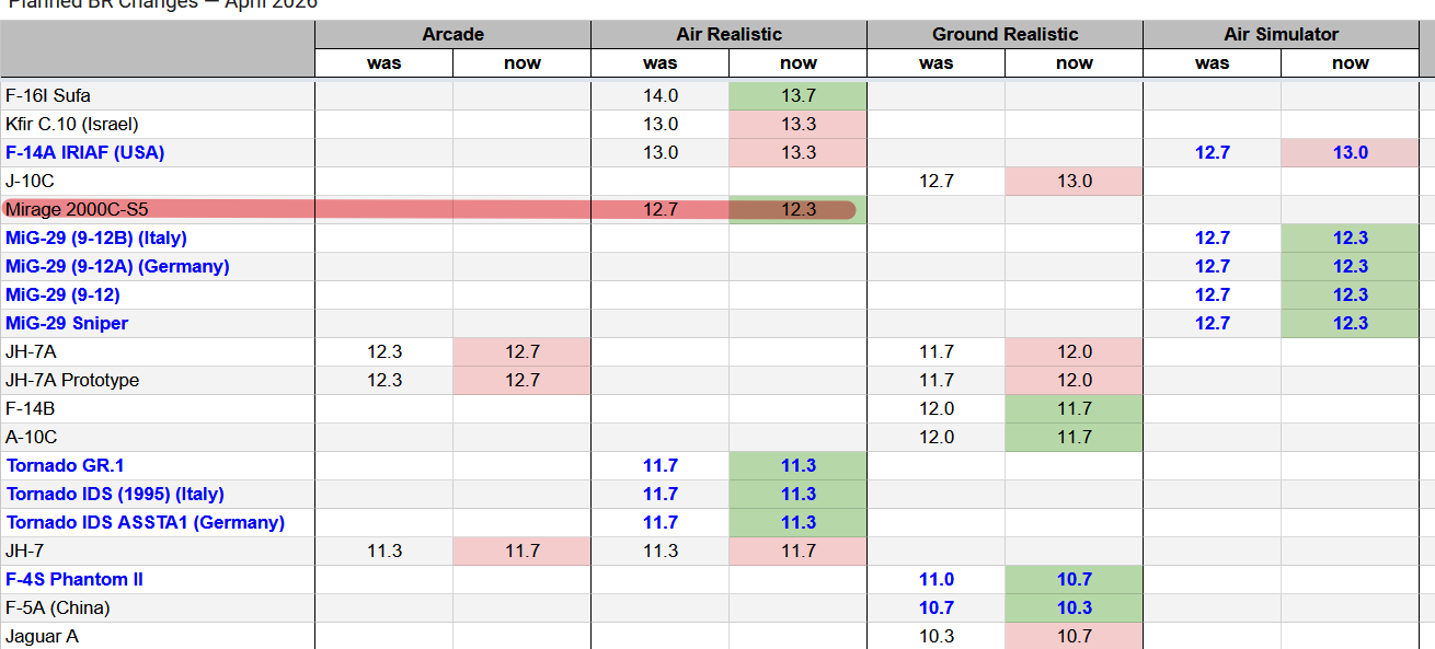 In the April BR adjustment, the Mirage 2000C-S5 was adjusted down to 12.3. However, its two ground-attack variant remain at 12.3 and 12.7 respectively—clearly overlooked in the process. Admittedly, I initially forgot about these two aircraft as well; otherwise, I wouldn’t be posting about this now.
