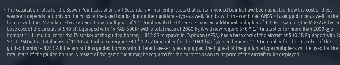 - There’s a massive surcharge for any guided weapon. (Image from changelog below)