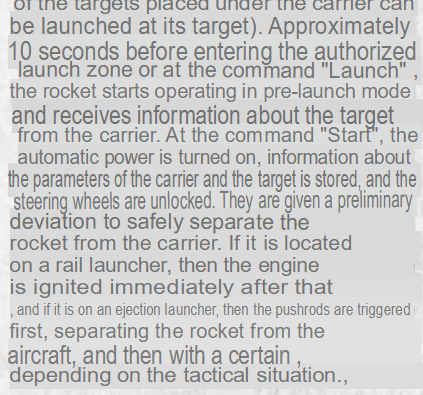 At the command “start”, the automatic power is turned on, and information about the target is stored in the missile and the fins are unlocked. They are given a preliminary deviation from the carrier in order to safely separate from the carrier.