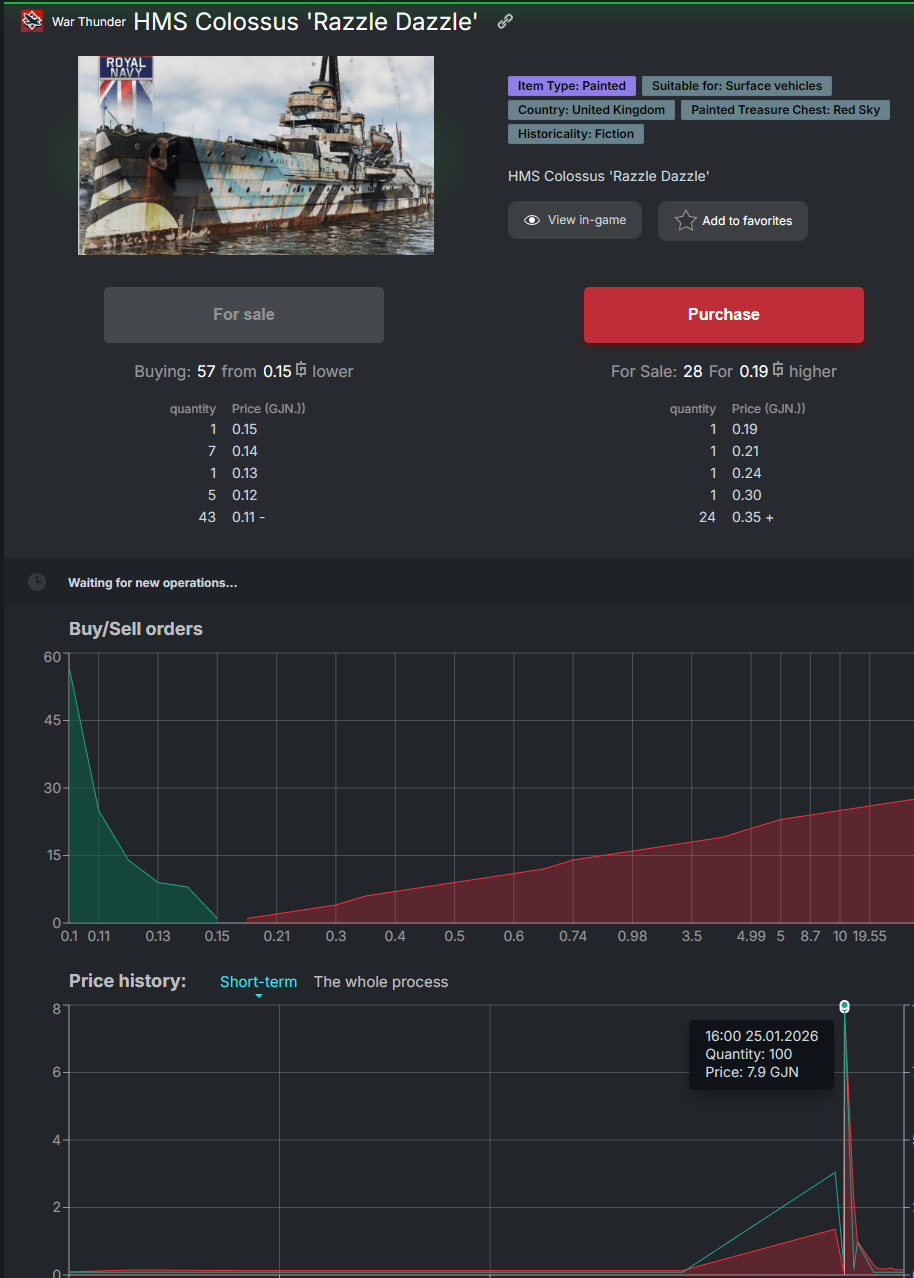 Bulk buying cheap items can be easily translated into GJN transfer between accounts, which this is the most radical thought, as Gaijin Market is completely anonymous, you can’t tell who made the transaction, is not a public data. But at the same time you can consider someone just bought it at large volumes by accident or simply by wanting to buy and re-sell it later, regardless, the money is flowing.