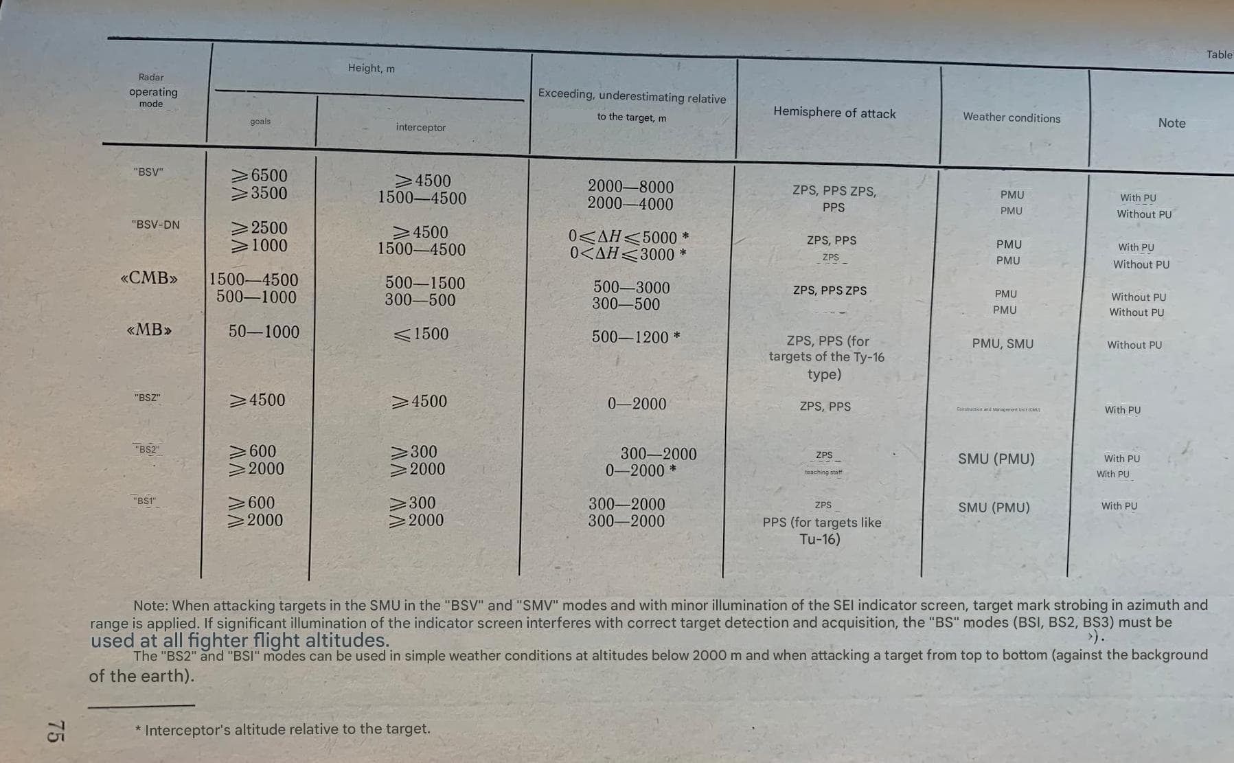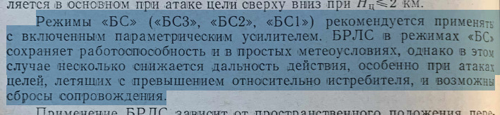 The “BS” modes (“BS3”, “BS2”, “BS1”) are recommended for use with the parametric amplifier enabled. The radar system remains operational in “BS” modes even under mild weather conditions; however, in this case, the detection range is slightly reduced, especially during attacks on targets flying above the fighter, and tracking interruptions may occur.