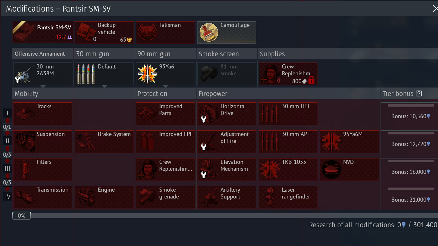 Pantsir SM-SV - 301k (insane), I guess here you have range finder, tvd, missles and artilery which are useful, but still the cost is insane