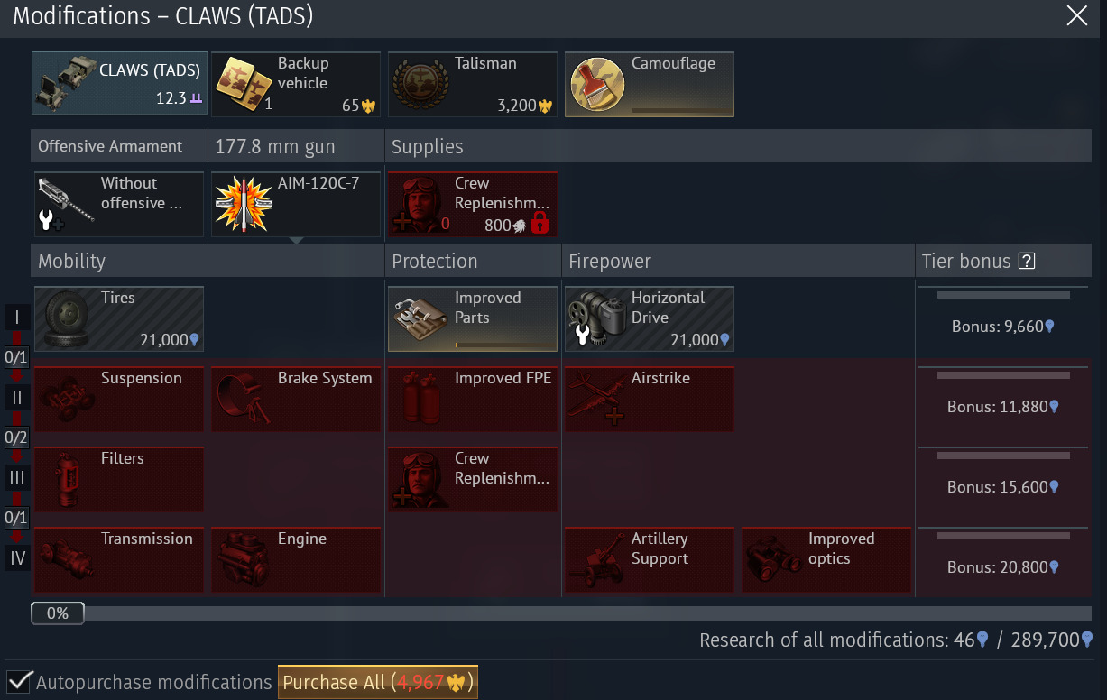 CLAWS - 289k research points, other than artilery they literally don’t matter.