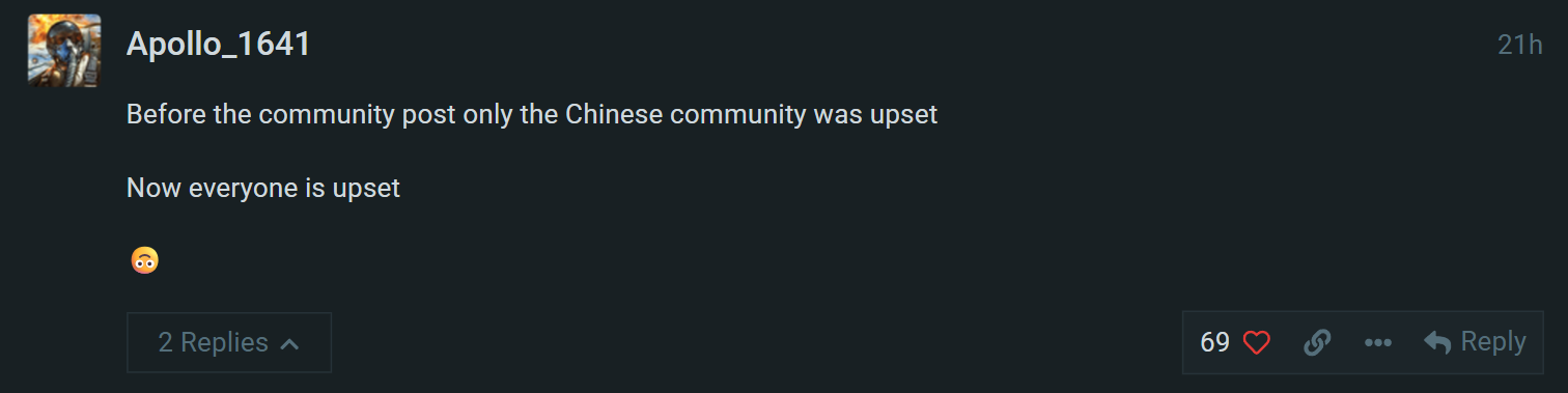 另外,我希望你们在回复的时候,可以更加有诚意一点,哪怕发个问卷问问,看看到底是哪个环节出了问题呢。现在这个顾左右而言其他的回复,可以说是不合格的,我们需要看到官方作出更为明确的答复,比如中系已经通过issue实装时间,又或者是说明为什么一些视频类资料可以通过issue而中系的不行,同时我建议官方可以给出一个计划表,在这个表上面明确说明,官方想在什么版本想试试看什么东西,例如地图扩大、反辐射弹机制、载具权重拉伸计划这种。