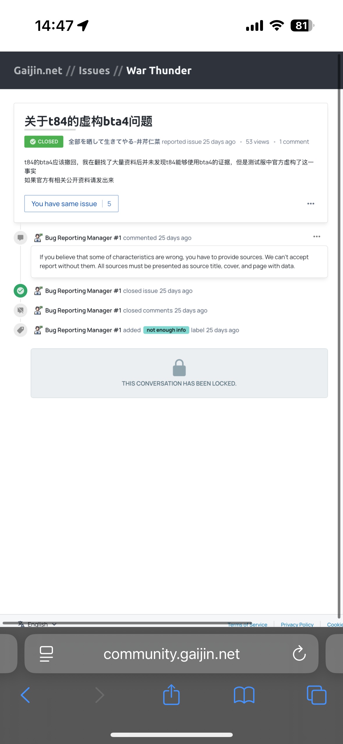 你去看看最开始的问题,中系所有装弹机集体下沉,但是到了日本线上VT4的装弹机就魔法般的正常了,而且中系线上的还是没变。我们的呼声一开始是为了公平,但是Gaijin作死在九三前后发帖就突然变得和政治有关了。