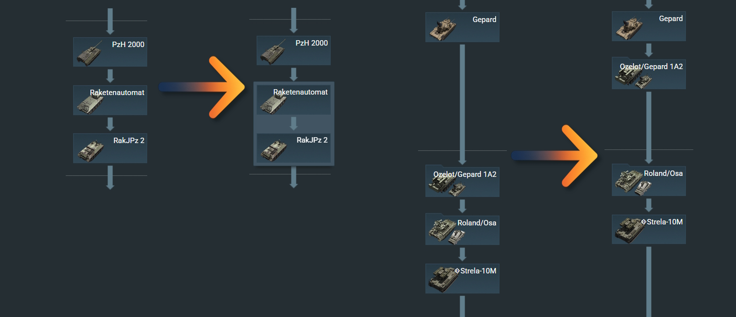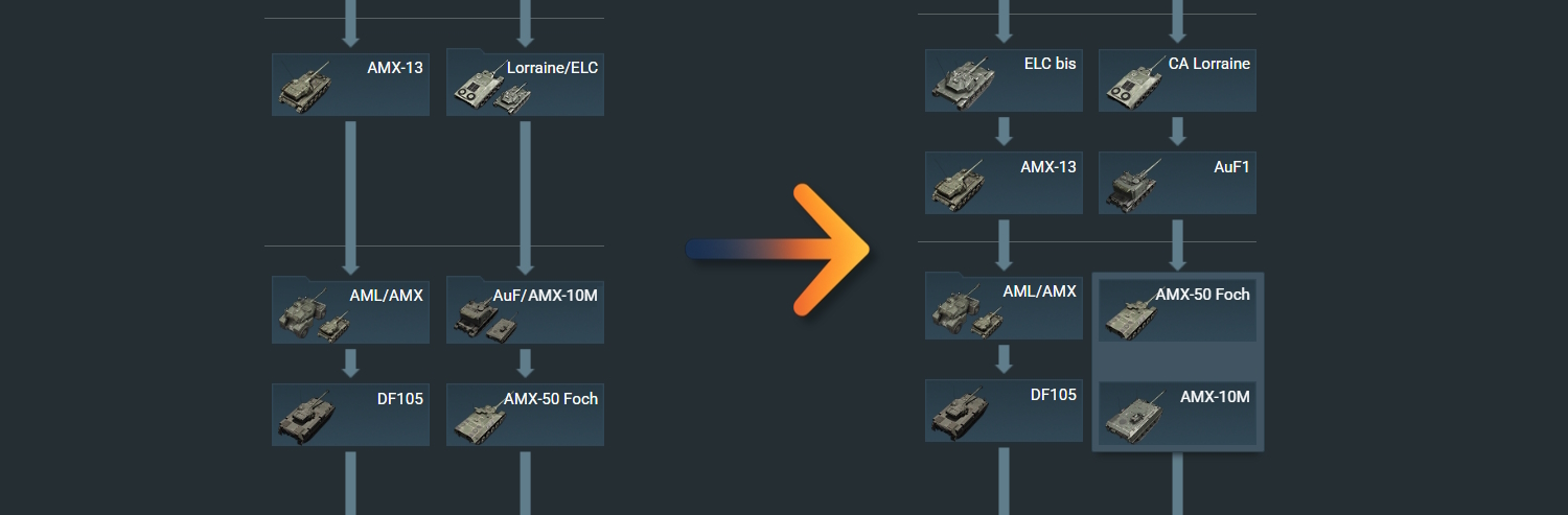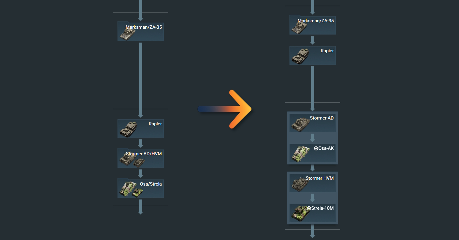 다음 메이저 업데이트 릴리스 후, 육군 트리 내에 존재하는 일부 지상 장비들이 재배열될 예정입니다 (해당 장비들은 현재 특별한 아이콘으로 표시됩니다) 이러한 변경점을 통해 트리의 구조를 개선하고 배틀 레이팅이 장비의 랭크에 더 잘 반영될 수 있도록 하여 더욱 원활한 진행을 돕고자 합니다.