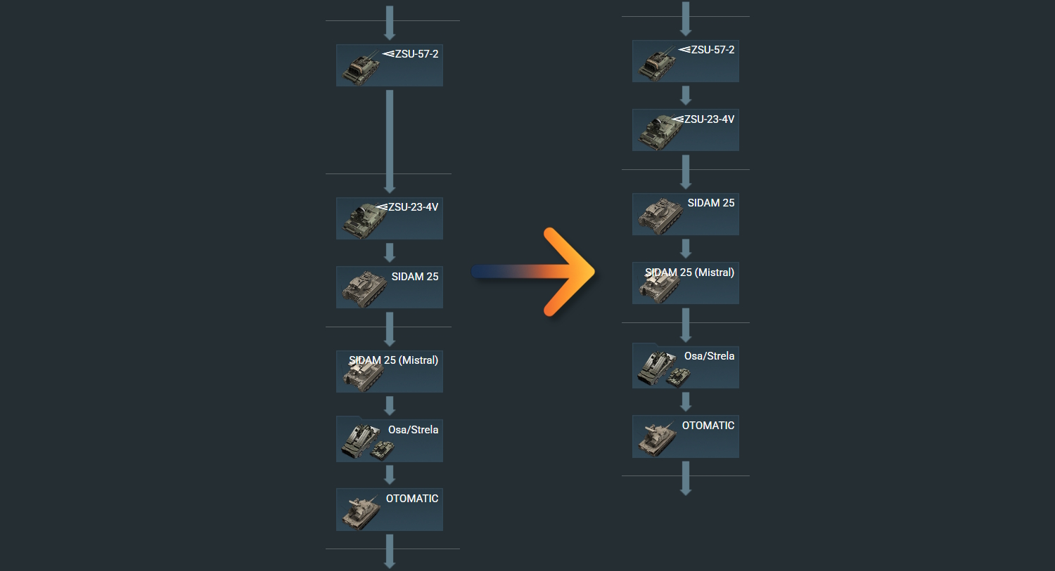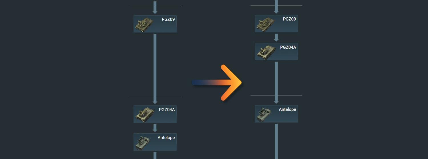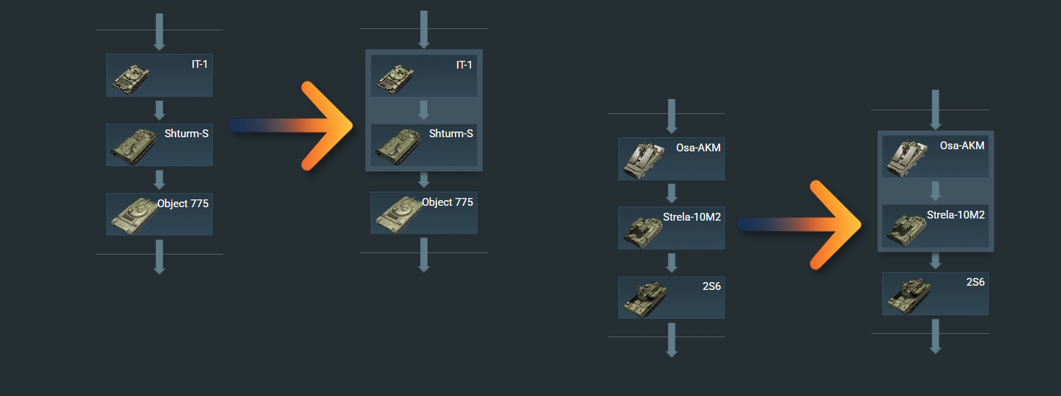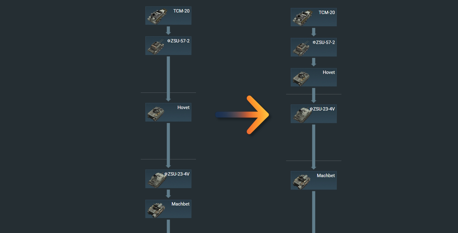다음 메이저 업데이트 릴리스 후, 육군 트리 내에 존재하는 일부 지상 장비들이 재배열될 예정입니다 (해당 장비들은 현재 특별한 아이콘으로 표시됩니다) 이러한 변경점을 통해 트리의 구조를 개선하고 배틀 레이팅이 장비의 랭크에 더 잘 반영될 수 있도록 하여 더욱 원활한 진행을 돕고자 합니다.