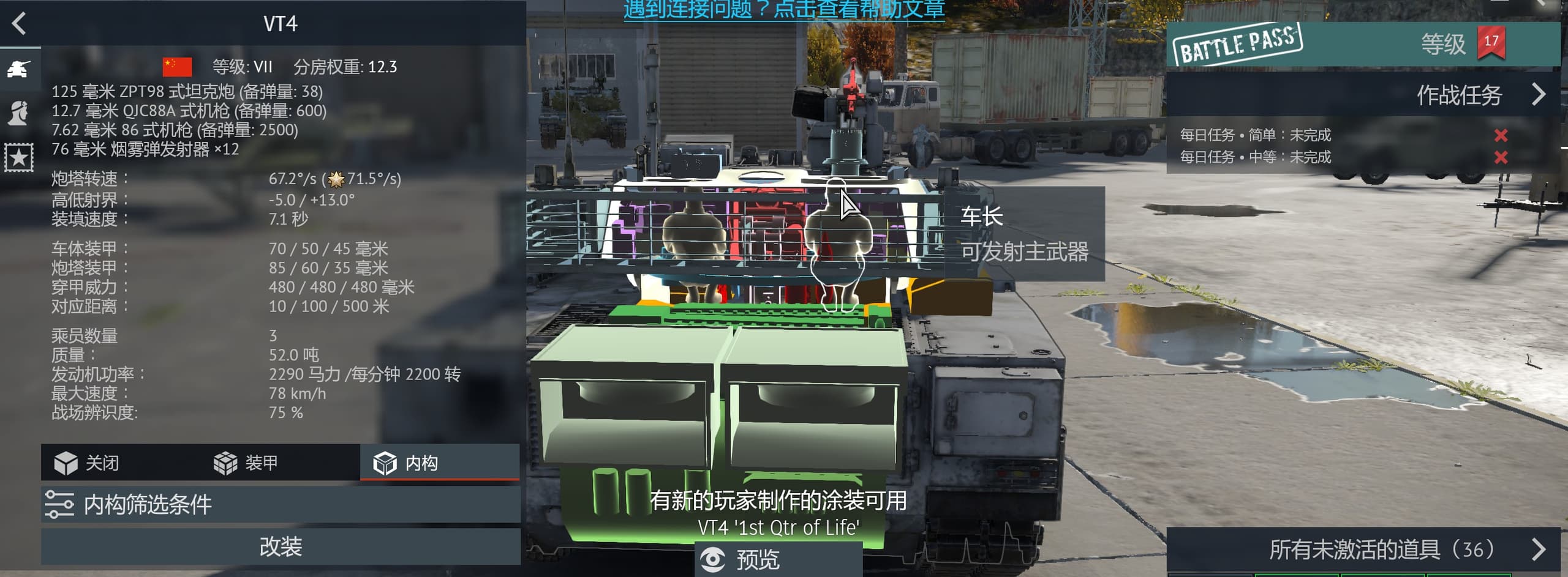 我很高兴中系终于有了带内衬的主战坦克。但是之前测试服做出的上调装弹机的改动为什么又撤回了呢?这导致VT4A1的成员组在飘了起来的同时,装弹机又回到了之前的情况。这是否表明抬装弹机和加内衬这两种生存性改动是被刻意留下的互斥选项呢?如果是的话,回调装弹机能不能把人也降回去啊,至少别让成员的头飞在车外面吧…