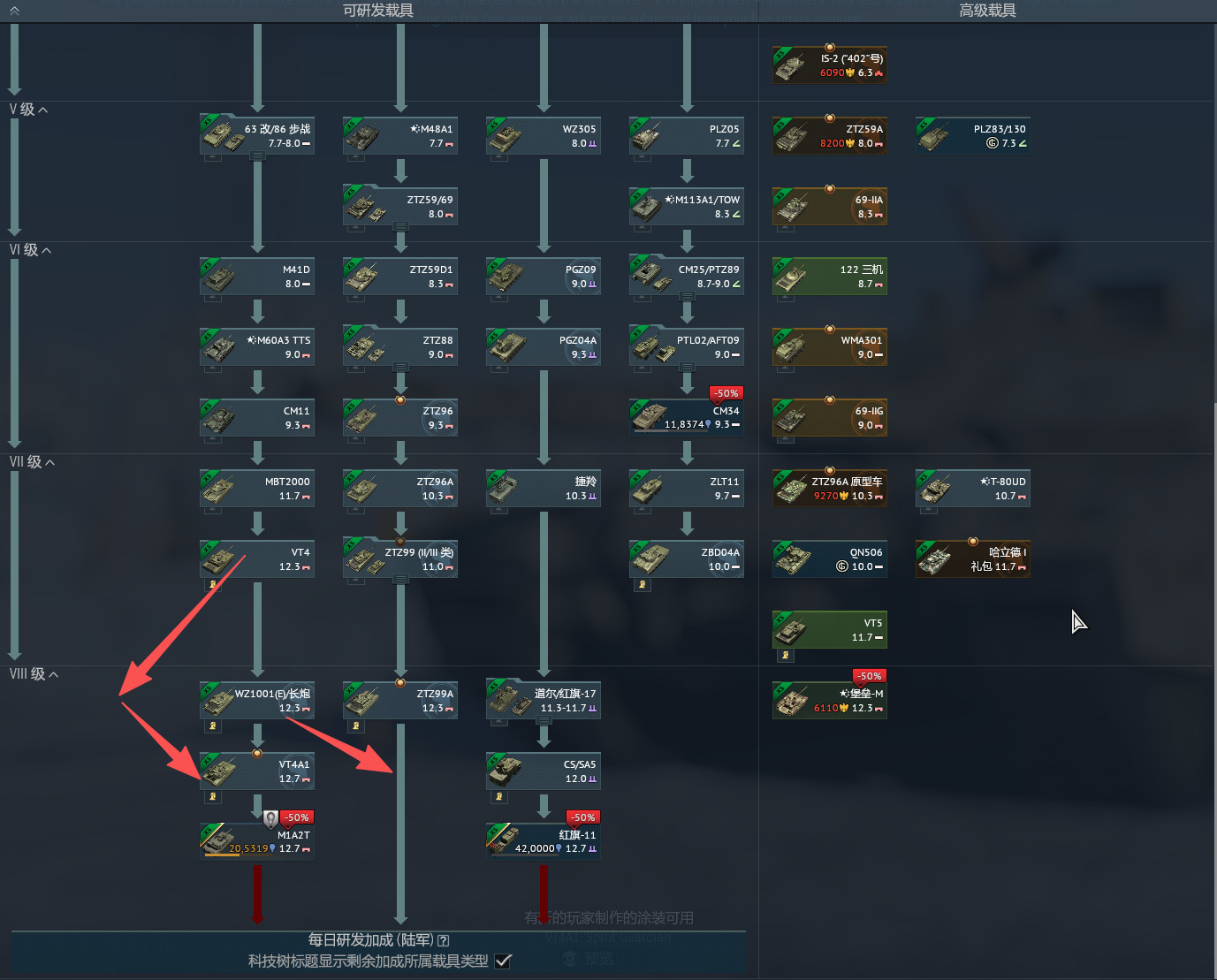 这样一来,M1线的七级载具变成一台,可以再选择预估权重10.0以上12.0以下的外贸/实验/台湾产载具加入游戏(比如CM11勇虎改进版,VT-2主战坦克,VT-5主战坦克的线上版本,ZTZ59G主战坦克等等),同时也解决了科技树长短失衡的问题,也解决了VT-4因为等级导致没有初始钢针的问题。