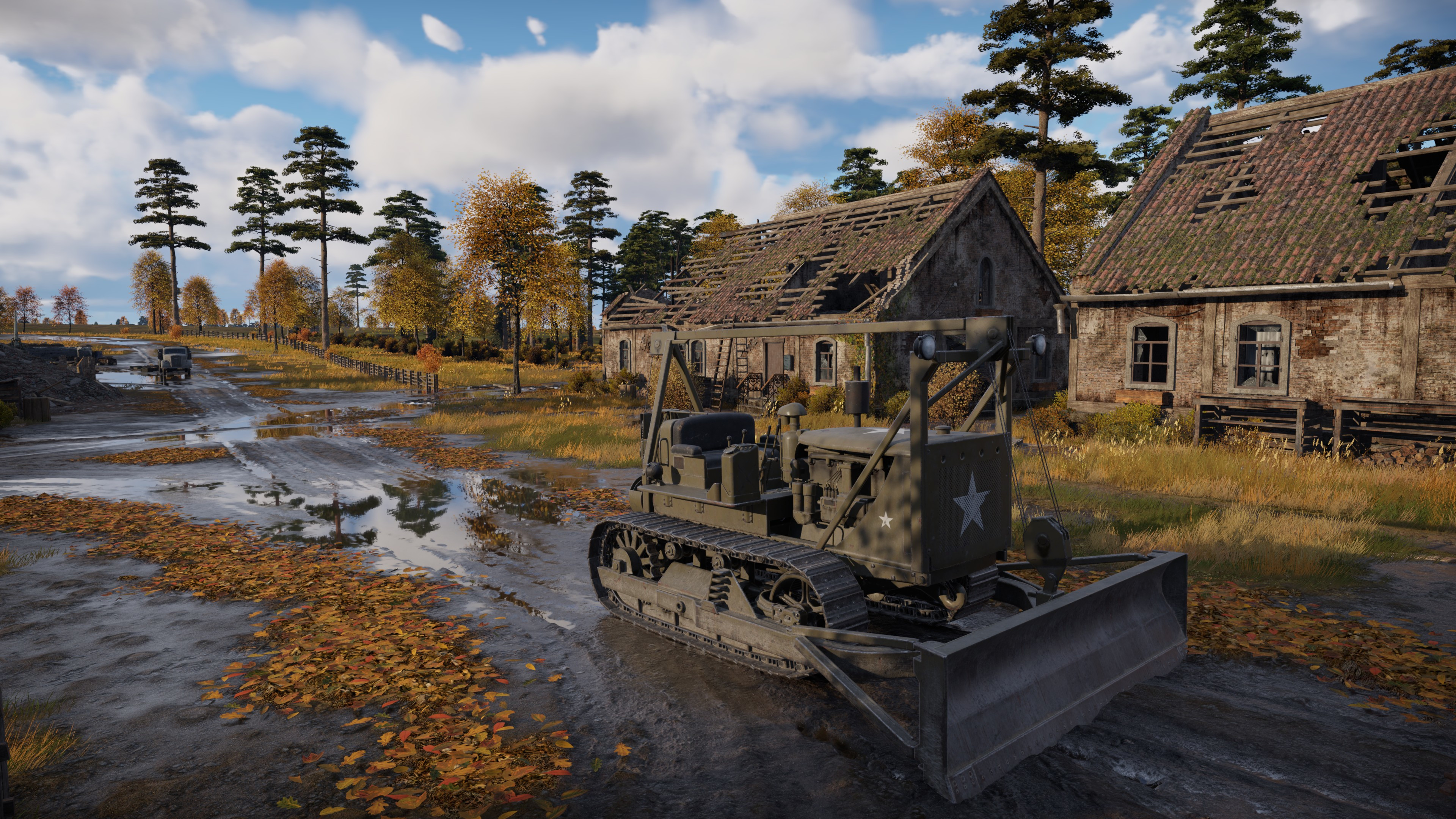 地形开阔、秋色尽染的阿登地图得到了全面翻新重制。各位车长们熟悉的废弃工事、坍塌的房屋、泥泞的水洼,还有满披金秋华彩的林木,都经开发团队以最新技术重新制作,精细呈现丰富的场景细节。地图的整体布局仍然维持不变,所有进攻路线、地形结构,以及车长们熟稔的绕侧路线都保持原样。在此基础上,我们新增包括废弃工程车辆在内的可移动场景元素,玩家推动这些推土机和拖拉机可以作为临时掩体使用,让危机四伏的巷战环境多一份安全感。
