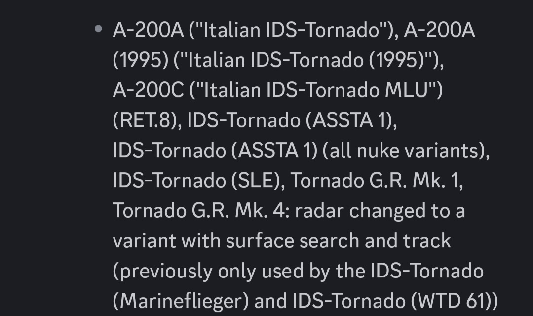 yeah for tornado not have enought info for her amrament but for all type of prototype only 1-2 number builded has enought info for armament,munution,armor… but for this no to add min 4 ir giuded bomb…